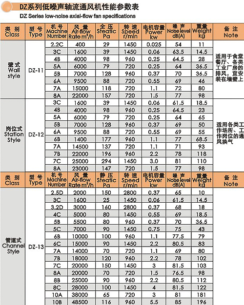 DZ系列低噪声轴流风机采用宽叶片大弦长,空间扭曲、倾斜式叶形,从声源学入手,利用低转速、高压力系数的设计方法来达到工程所需风量、风压的要求,同时也使风机具备效率高、噪声低、能耗省、运行平稳的特点。